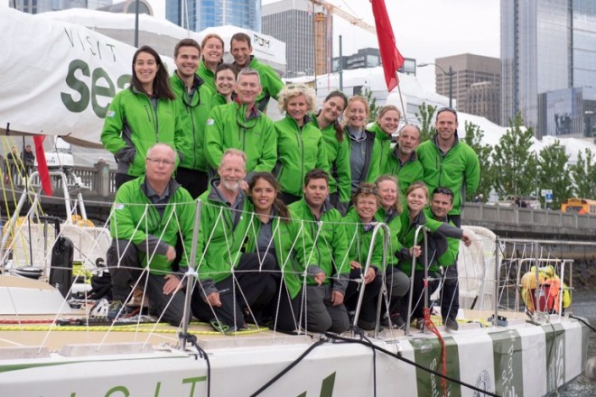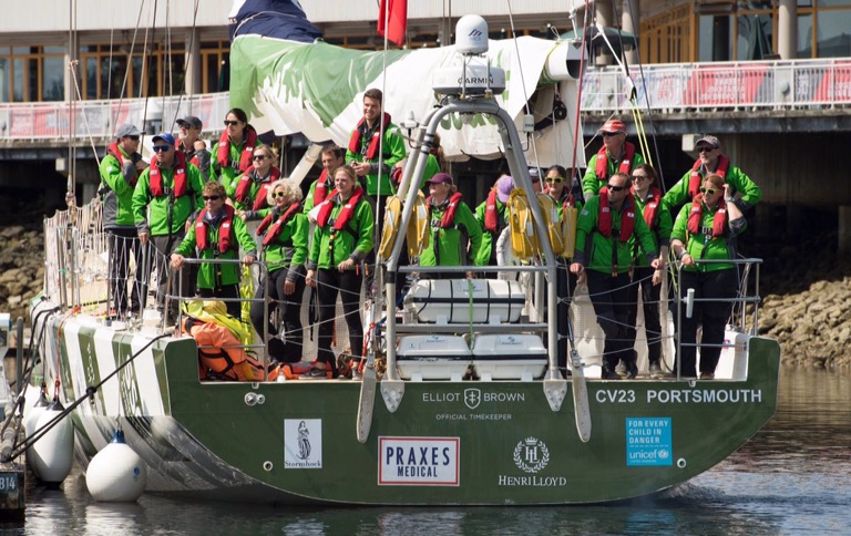 Once on the boat, the morning was spent doing final preparations for the race. For me, this meant filling up the water tanks using the slowest hose in the world followed by disposing rubbish whilst others stowed fresh food on board. Final coffee runs were made (this has turned out to be exceptionally tragic as the cafetière on the boat was BROKEN) team photos were taken of us in our green kit and then the processing began. We processed up high, then officially processed down to the boats following a marching band. We processed (being the home crew) holding a number 12 flag. Apparently this represents the fans for the Seattle Seahawks football team. I was just hoping that it didn’t represent our finish position.