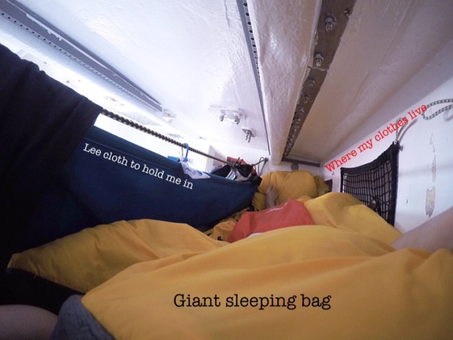 Lying in my bunk has not proven to be as simple as it sounds as on a couple of occasions, I’ve had to cling on in my sleep whilst the boat rocks over. Normally, everyone shares a bunk with a person on the other watch, but as we have 19 crew on board, we have uneven watches. This means I am in the exceptionally lucky position of being the 10th crew member of my watch aka I have a bunk to myself. This is pretty wonderful. It does take a certain amount of ingenuity to get into my bunk though as its one of the upper ones. Currently, I cry “Ninjaaaaa”, get both feet on the wall, duck my head under the bungee line I’ve rigged up to hang my kit, get my back against the edge of the bunk and then kind of pivot myself in horizontally. 9/10 times I bang my head on the pipe casing that runs down the centre of the ceiling of my bunk. This also makes it quite tricky to take clothes on and off in it. But once I’m in, I tie my lee cloth (a cloth that runs down the edge of the bunk) to hold myself in and I’m away.