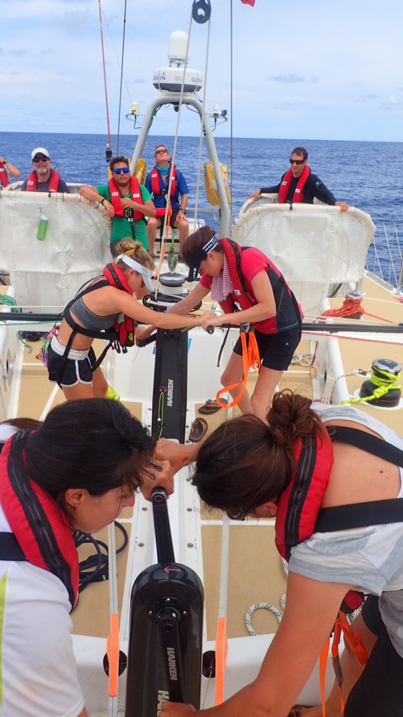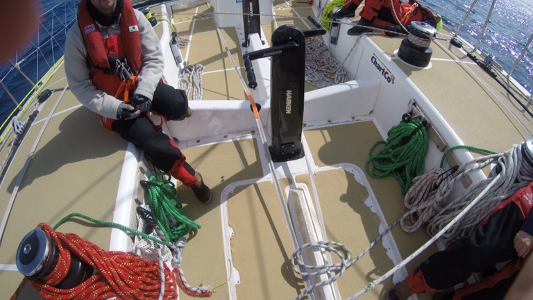 As of the beginning of this week though, somehow we’re with the front pack of boats. Miracle! For once, we have boats all around us and visible on our navigation system to compare against. To make sure we stay in the front pack, the focus is now on adjusting the sails constantly (“trimming”) for maximum speed, quite a change from the previous race where sails could be put up and left for days. Now, there are always a couple of us stationed on the grinder, ready to grind like hell whenever required to adjust the code 1 Spinnaker when we’re flying it. Whilst the trimming seems to be paying off for boat speed, the previous harmony of our watch has been disrupted, terse words being exchanged as sail changes and adjustments are debated by the experienced sailors on board. I’m just happy to do what I’m told being still consciously incompetent at this sailing malarkey.