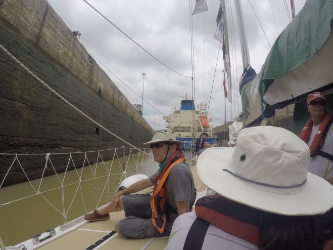 After slipping lines at around 6am, we had a “pilot” join us on the boat to steer a Visit Seattle through the canal. Through the bridge of the Americas we went before entering the vast lock system. Ourselves, PsP and Danang were tethered together to form a Clipper-raft following a huge ship through the locks. We were on the outside of this raft, so at each lock, men with ropes and a precision aim would throw ropes to us that we would tie into. These men would then literally walk us through the lock as they filled: up we went on the Pacific side, down we came on the Atlantic. Each lock had 2 sets of vast steel gates, these being the original ones installed in 1914. Coming down the locks on the Atlantic side was particularly impressive as you’d start st the same height as ships ahead of you before lowering down.