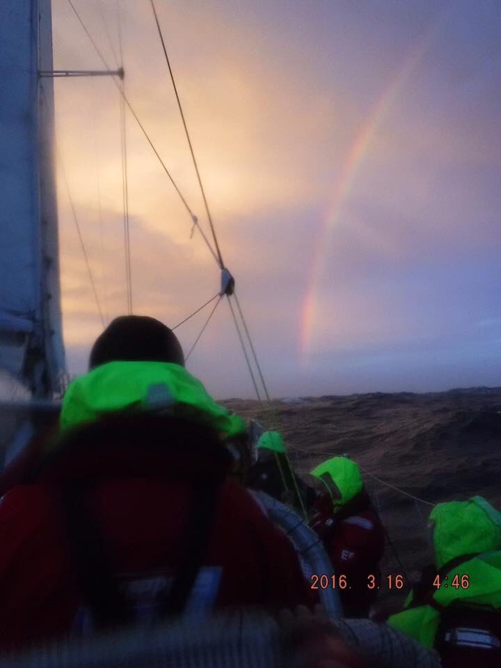 This is the life. The last few days of this week has returned us to the calmer waters and the flatter boat of leg 7. It’s still chilly at night but it’s now easier to move around, easier to sleep and all-round, more positive. I’ve been living on this boat for the best part of 2 months now but have to keep reminding myself what a special experience this is. Standing on deck and looking out to sea, you become conscious that you really are in the middle of a vast OCEAN on a PLANET, and wow, isn’t it big: 1,300 miles in, still around 1,800 to go before we get to Ireland. Some highlights his week have been when we had 2 beautiful vivid rainbows at sunset against a golden sky, shortly after accompanied by Dolphins.